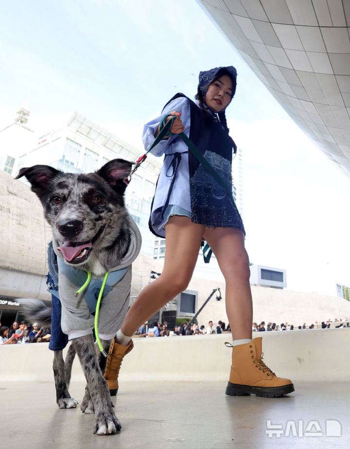 [서울=뉴시스] 홍효식 기자 = 14일 서울 중구 동대문디자인플라자(DDP) 어울림광장에서 열린 '댕댕 런웨이'에서 반려견들이 반려인과 제로웨이스트 패션쇼를 하고 있다. 2025.09.14. yesphoto@newsis.com